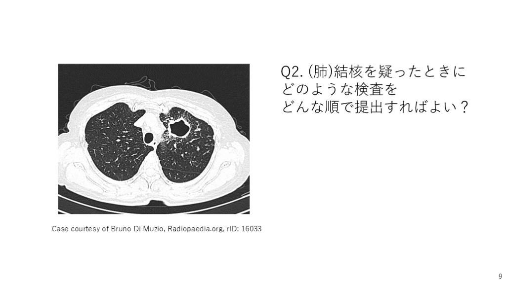 #9. 9 Case courtesy of Bruno Di Muzio, Radiopaedia.org, rID: 16033 Q2. (肺)結核を疑ったときにどのような検査をどんな順で提出すればよい?