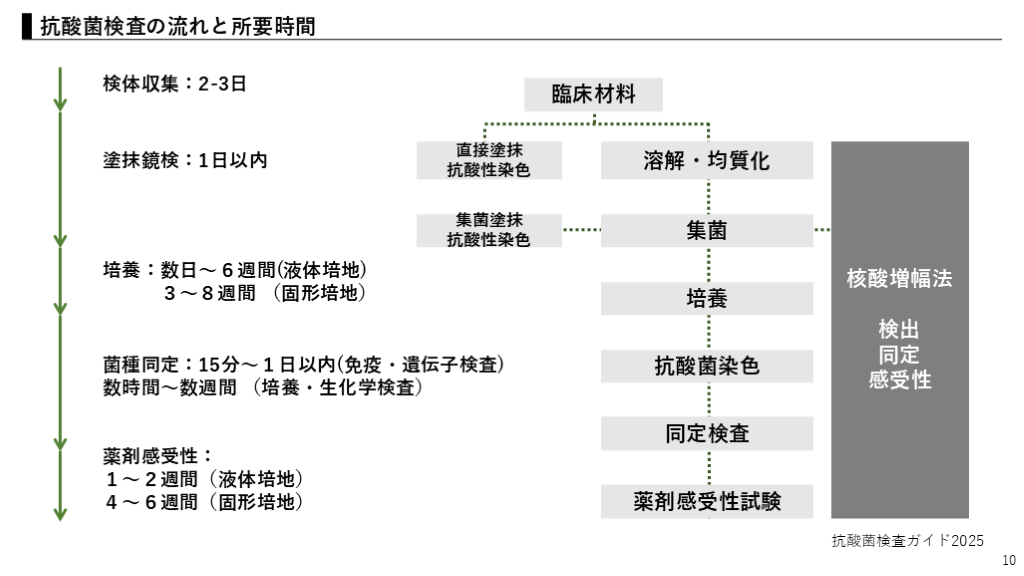 #10. 10 抗酸菌検査の流れと所要時間 集菌 培養 抗酸菌染色 同定検査 核酸増幅法
