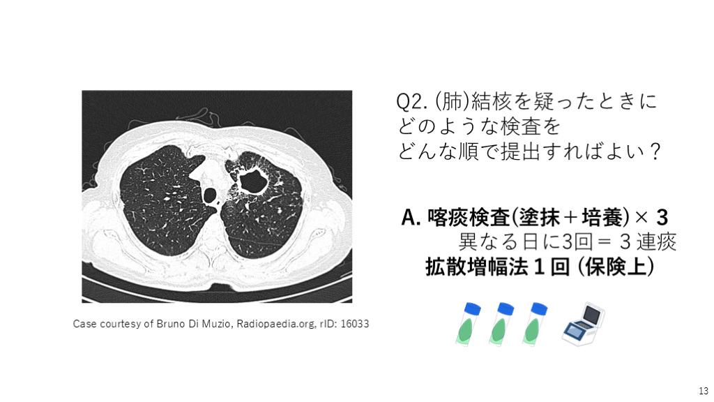 #13. 13 Q2. (肺)結核を疑ったときにどのような検査をどんな順で提出すればよい? Case courtesy of Bruno Di Muzio, Radiopaedia.org, rID: 16033 A. 喀痰検査(塗抹+培養)×3 異なる日に3回=3連痰 拡散増幅法1回 (保険上)