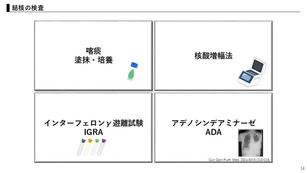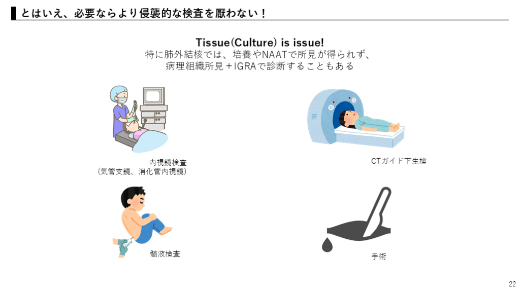 特に肺外結核では、培養やNAATで所見が得られず、病理組織所見+IGRAで診断することもある CTガイド下生検 手術 内視鏡検査