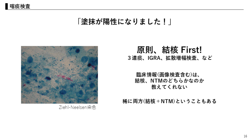#16. 16 喀痰検査 「塗抹が陽性になりました!」 Ziehl-Neelsen染色 原則、結核 First!