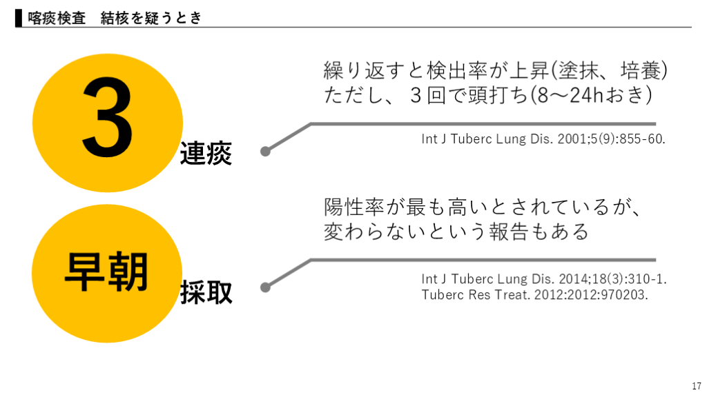 #17. 17 3 連痰 喀痰検査 結核を疑うとき Int J Tuberc Lung Dis. 2001;5(9):855-60. 繰り返すと検出率が上昇(塗抹、培養)