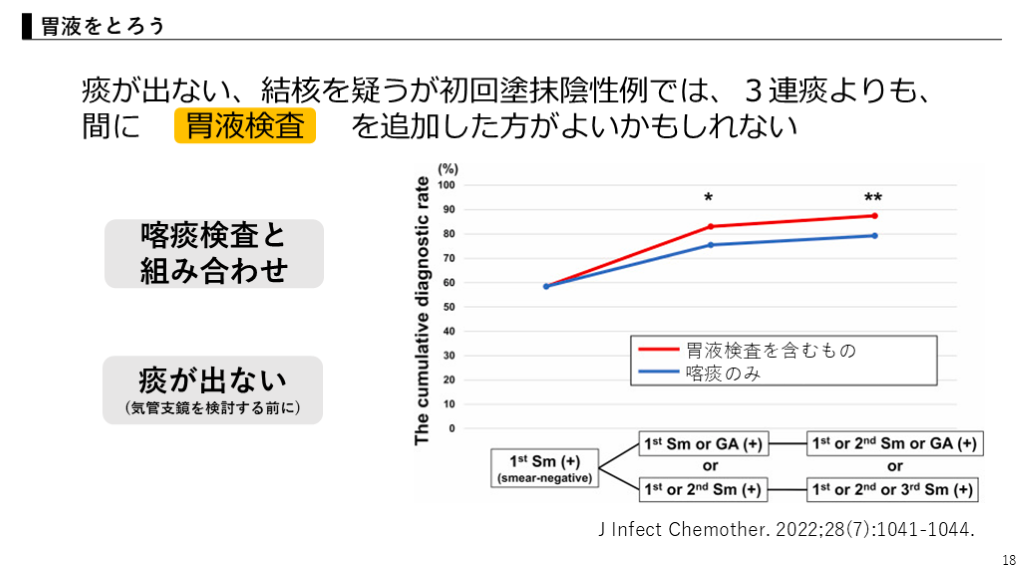 #18. 18 胃液をとろう J Infect Chemother. 2022;28(7):1041-1044. 痰が出ない、結核を疑うが初回塗抹陰性例では、3連痰よりも、間に を追加した方がよいかもしれない 胃液検査 痰が出ない(気管支鏡を検討する前に) 喀痰検査と