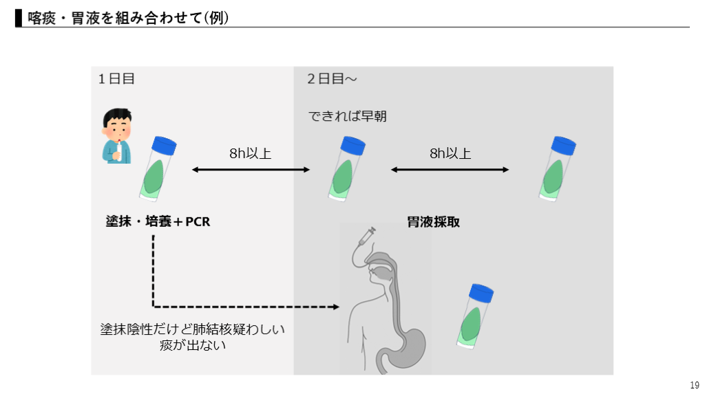 #19. 19 喀痰・胃液を組み合わせて(例) 8h以上 8h以上 1日目 2日目〜 塗抹・培養+PCR 塗抹陰性だけど肺結核疑わしい