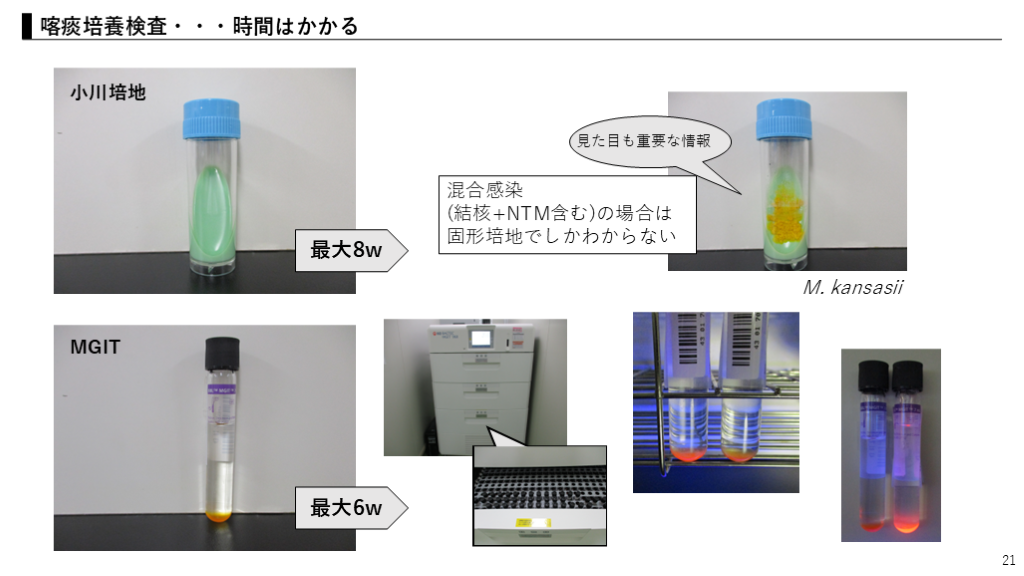 #21. 21 喀痰培養検査・・・時間はかかる 小川培地 MGIT M. kansasii 最大8w 最大6w 見た目も重要な情報 混合感染