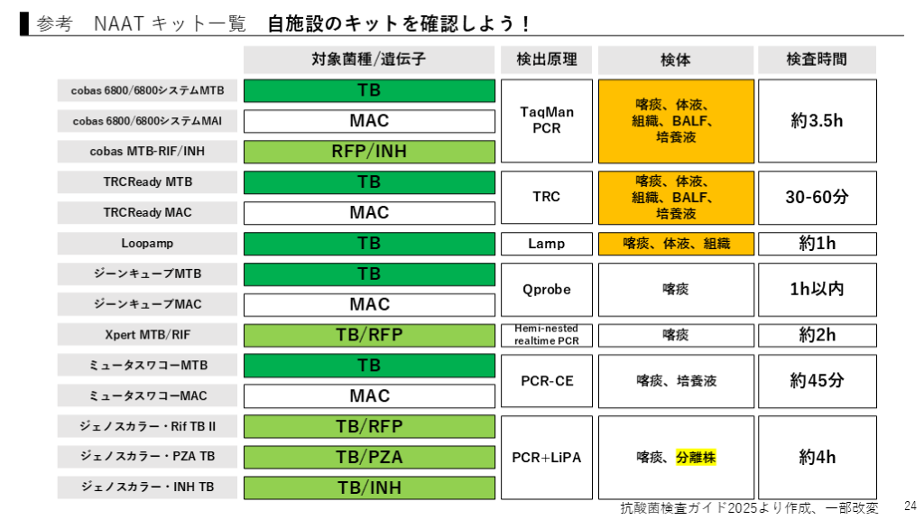 #24. 24 対象菌種/遺伝子 検出原理 TB TaqMan PCR MAC RFP/INH cobas 6800/6800システムMTB cobas 6800/6800システムMAI cobas MTB-RIF/INH 参考 NAAT キット一覧 自施設のキットを確認しよう! 検査時間 TB TRC MAC TB Lamp TRCReady MTB TRCReady MAC Loopamp 30-60分 約1h TB Qprobe MAC TB/RFP Hemi-nested realtime PCR ジーンキューブMTB ジーンキューブMAC Xpert MTB/RIF 1h以内 約2h TB PCR-CE MAC TB/RFP PCR+LiPA ミュータスワコーMTB ミュータスワコーMAC ジェノスカラー・Rif TB II 約45分 約4h TB/PZA ジェノスカラー・PZA TB TB/INH ジェノスカラー・INH TB 約3.5h 検体 喀痰、体液、