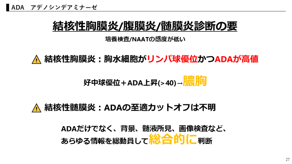 #27. 27 結核性胸膜炎/腹膜炎/髄膜炎診断の要 ADA アデノシンデアミナーゼ 培養検査/NAATの感度が低い ⚠️ 結核性胸膜炎:胸水細胞がリンパ球優位かつADAが高値 ⚠️ 結核性髄膜炎:ADAの至適カットオフは不明 好中球優位+ADA上昇(>40)→膿胸 ADAだけでなく、背景、髄液所見、画像検査など、あらゆる情報を総動員して総合的に判断