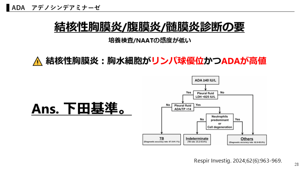 #28. 28 結核性胸膜炎/腹膜炎/髄膜炎診断の要 ADA アデノシンデアミナーゼ 培養検査/NAATの感度が低い ⚠️ 結核性胸膜炎:胸水細胞がリンパ球優位かつADAが高値 Respir Investig. 2024;62(6):963-969. Ans. 下田基準。