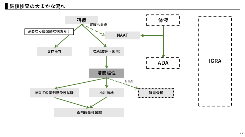 #29. 29 結核検査の大まかな流れ IGRA NAAT 培地(液体・固形) 喀痰 塗抹検査 体液 培養陽性 小川培地 薬剤感受性試験 MGITの薬剤感受性試験 ADA 質量分析 NTM? 胃液も考慮 必要なら侵襲的な検査も!