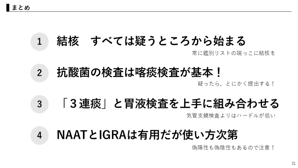 #31. 31 1 2 3 結核 すべては疑うところから始まる 抗酸菌の検査は喀痰検査が基本! 「3連痰」と胃液検査を上手に組み合わせる 4 NAATとIGRAは有用だが使い方次第 まとめ 疑ったら、とにかく提出する! 気管支鏡検査よりはハードルが低い 偽陽性も偽陰性もあるので注意! 常に鑑別リストの端っこに結核を