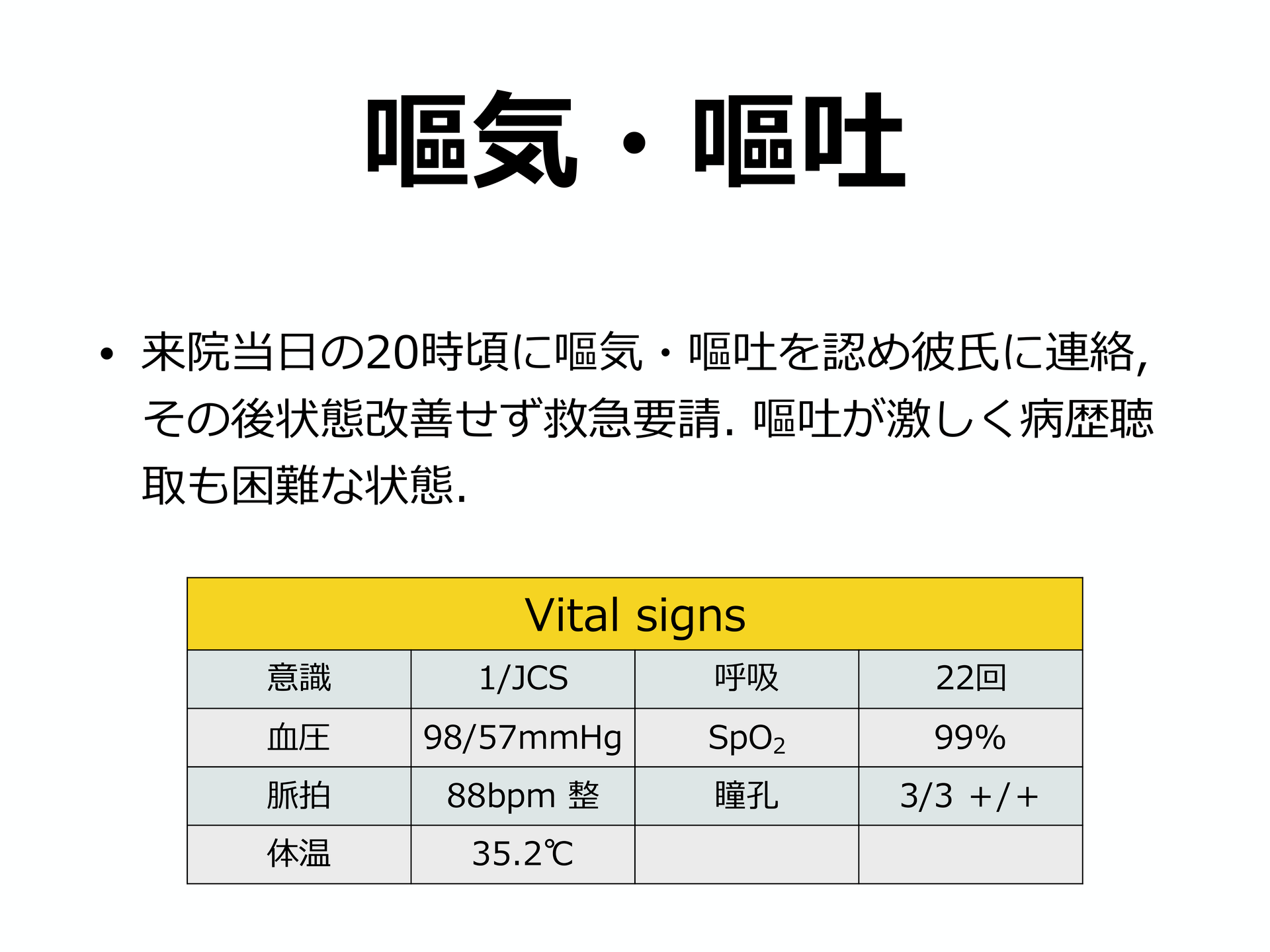#3. 嘔気・嘔吐 • 来院当日の20時頃に嘔気・嘔吐を認め彼氏に連絡, その後状態改善せず救急要請. 嘔吐が激しく病歴聴 取も困難な状態 . Vital signs 意識 1/JCS 呼吸 22回 血圧 98/57mmHg SpO 2 99% 脈拍 88bpm 整 瞳孔 3/3 +/+ 体温 35.2°C