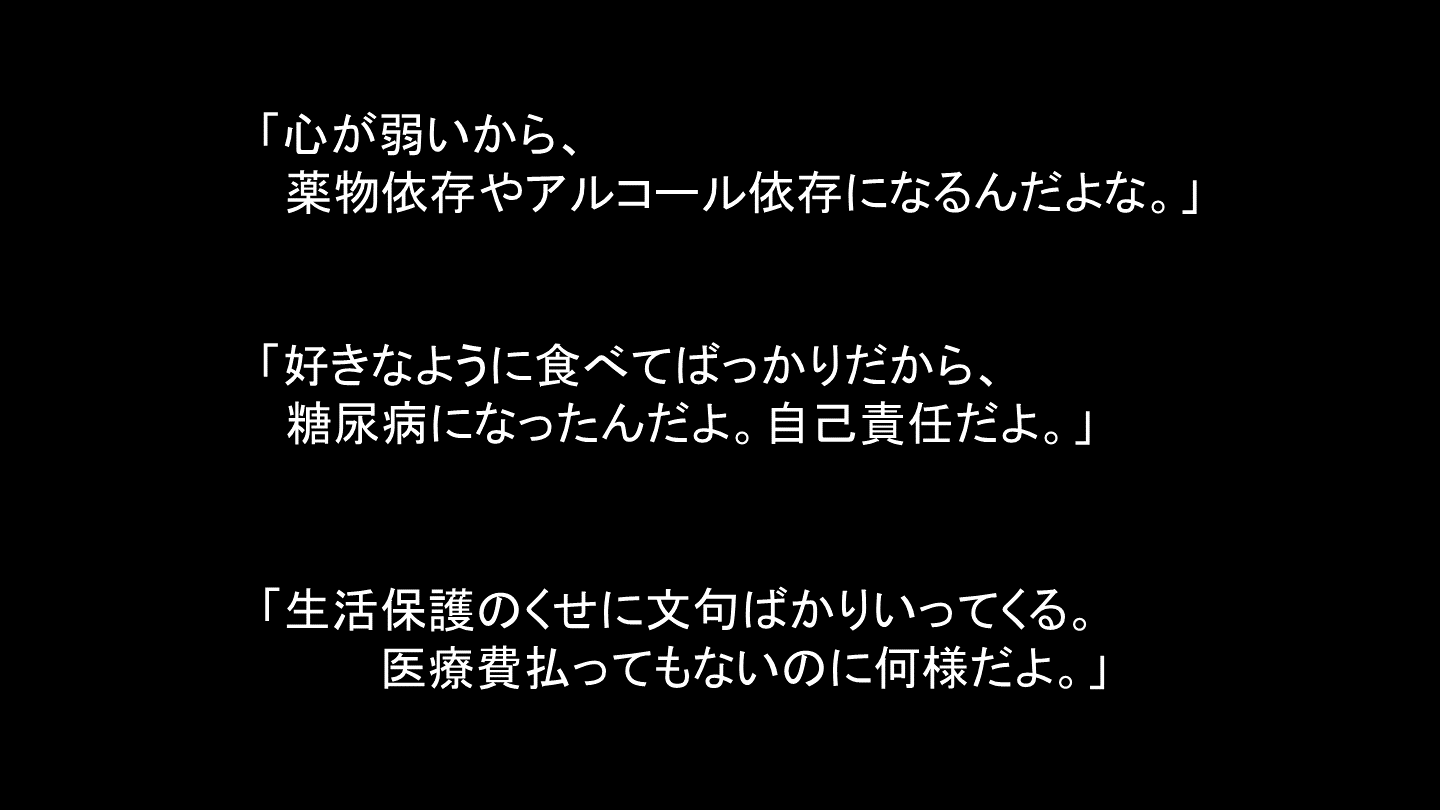 糖尿病になったんだよ。自己責任だよ。」 「生活保護のくせに文句ばかりいってくる。