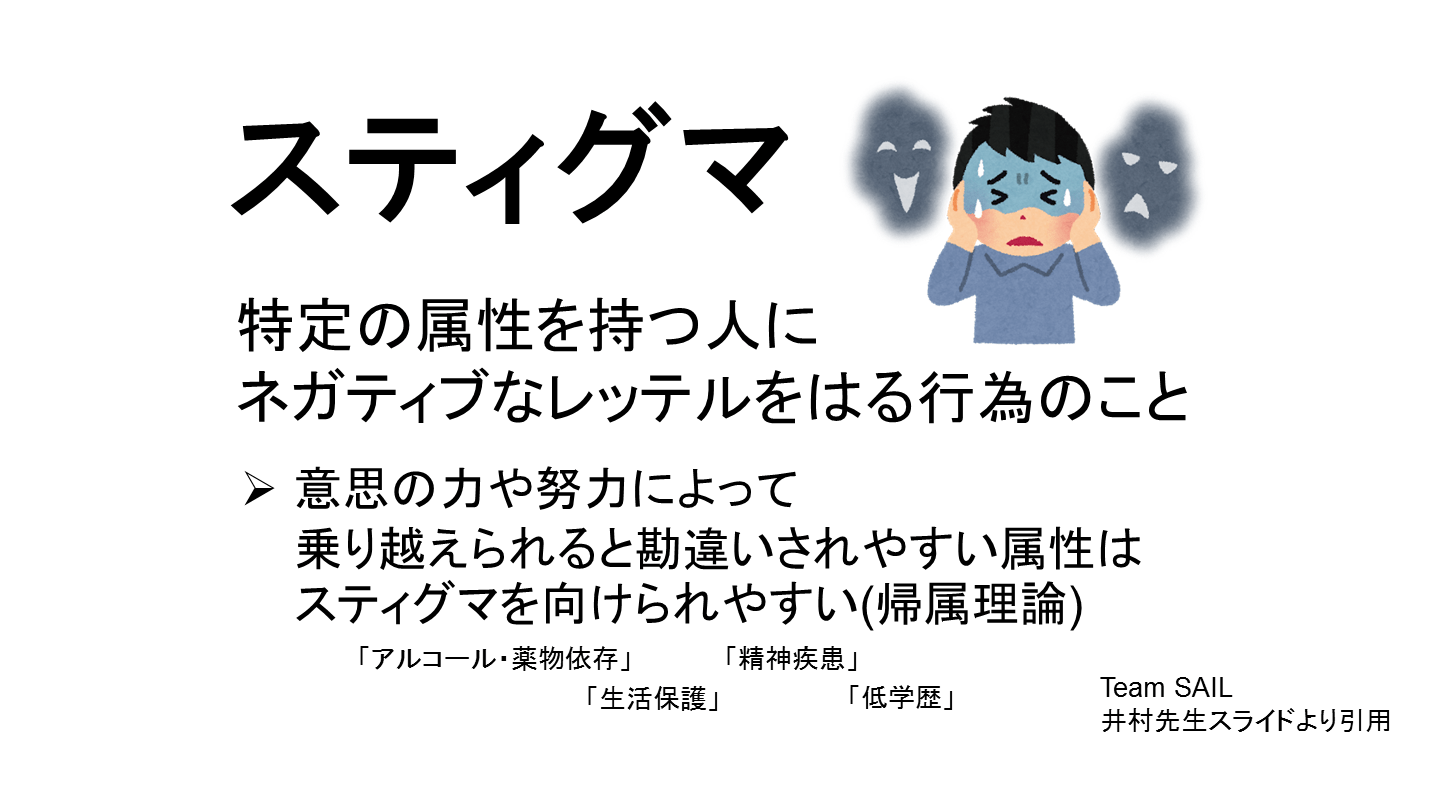 ネガティブなレッテルをはる行為のこと 意思の力や努力によって乗り越えられると勘違いされやすい属性はスティグマを向けられやすい(帰属理論) 「アルコール・薬物依存」 「生活保護」 「精神疾患」 「低学歴」 Team SAIL