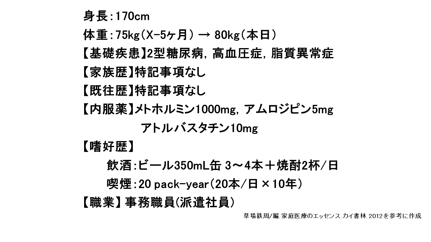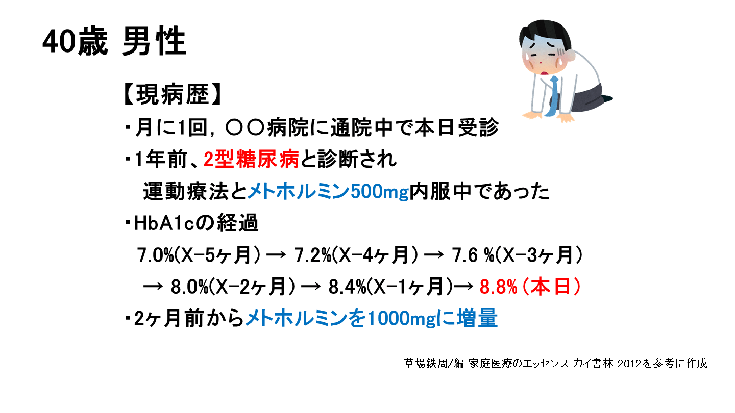 ・2ヶ月前からメトホルミンを1000mgに増量 草場鉄周/編. 家庭医療のエッセンス. カイ書林. 2012 を参考に作成
