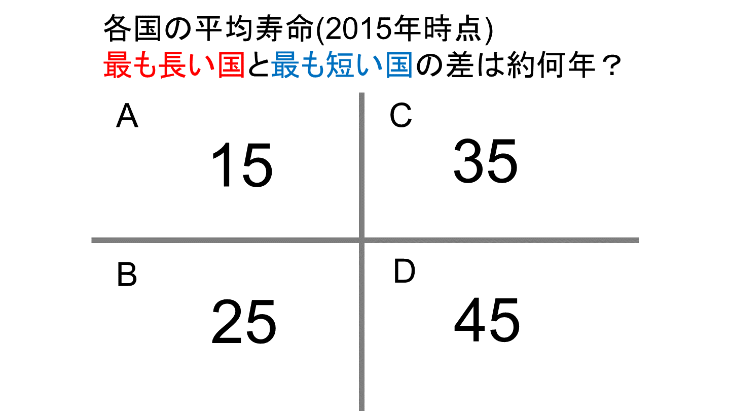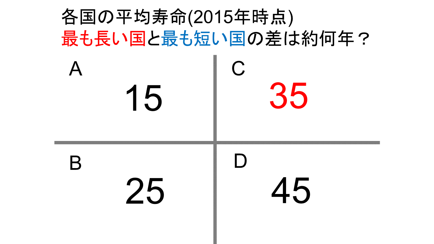 最も長い国と最も短い国の差は約何年? A B C D 15 25 35 45