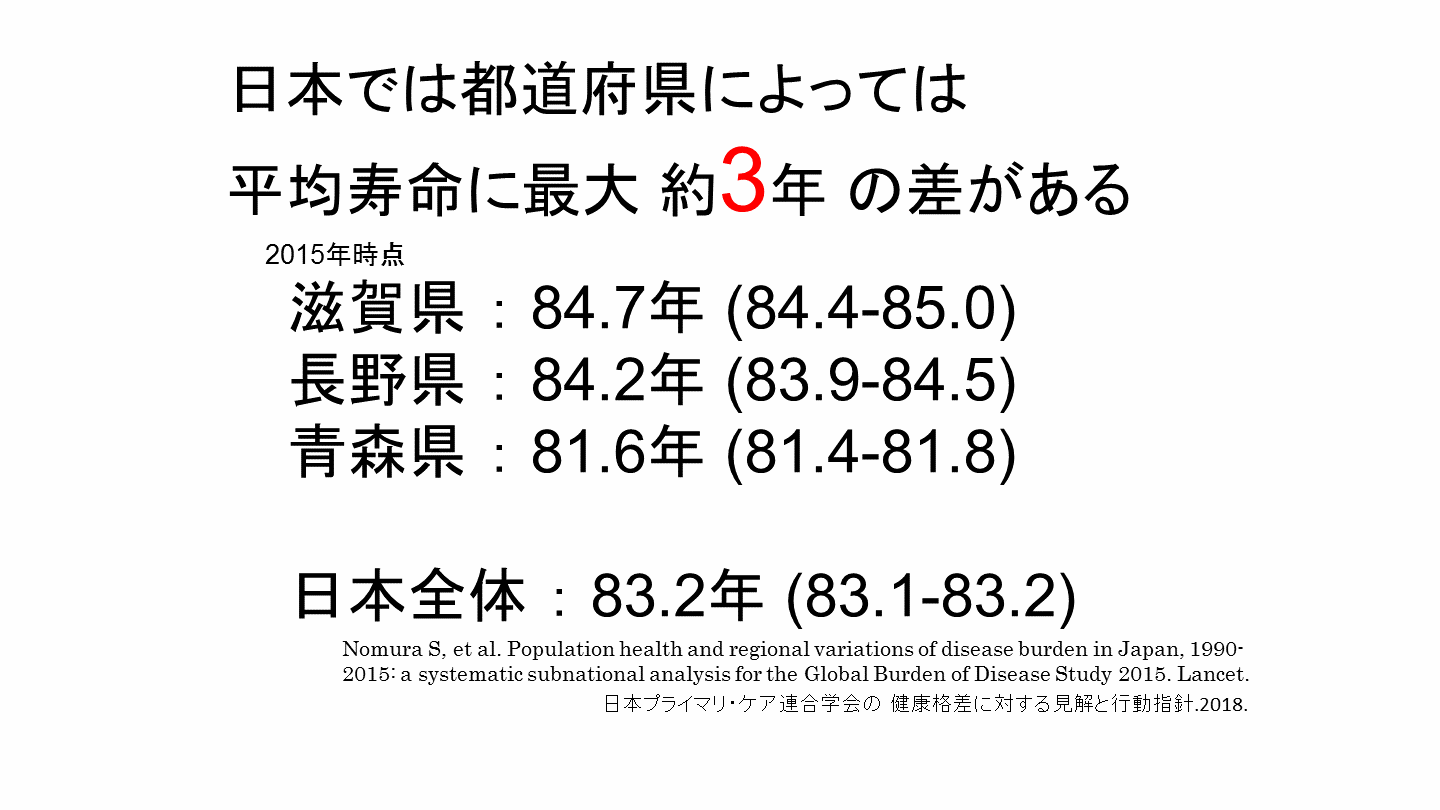 日本全体 : 83.2年 (83.1-83.2) 2015年時点 日本プライマリ・ケア連合学会の 健康格差に対する見解と行動指針.2018.