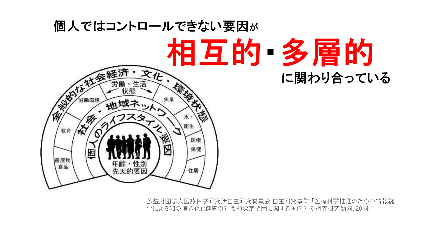 に関わり合っている 公益財団法人医療科学研究所自主研究委員会.自主研究事業.「医療科学推進のための情報統合による知の構造化」:健康の社会的決定要因に関する国内外の調査研究動向. 2014