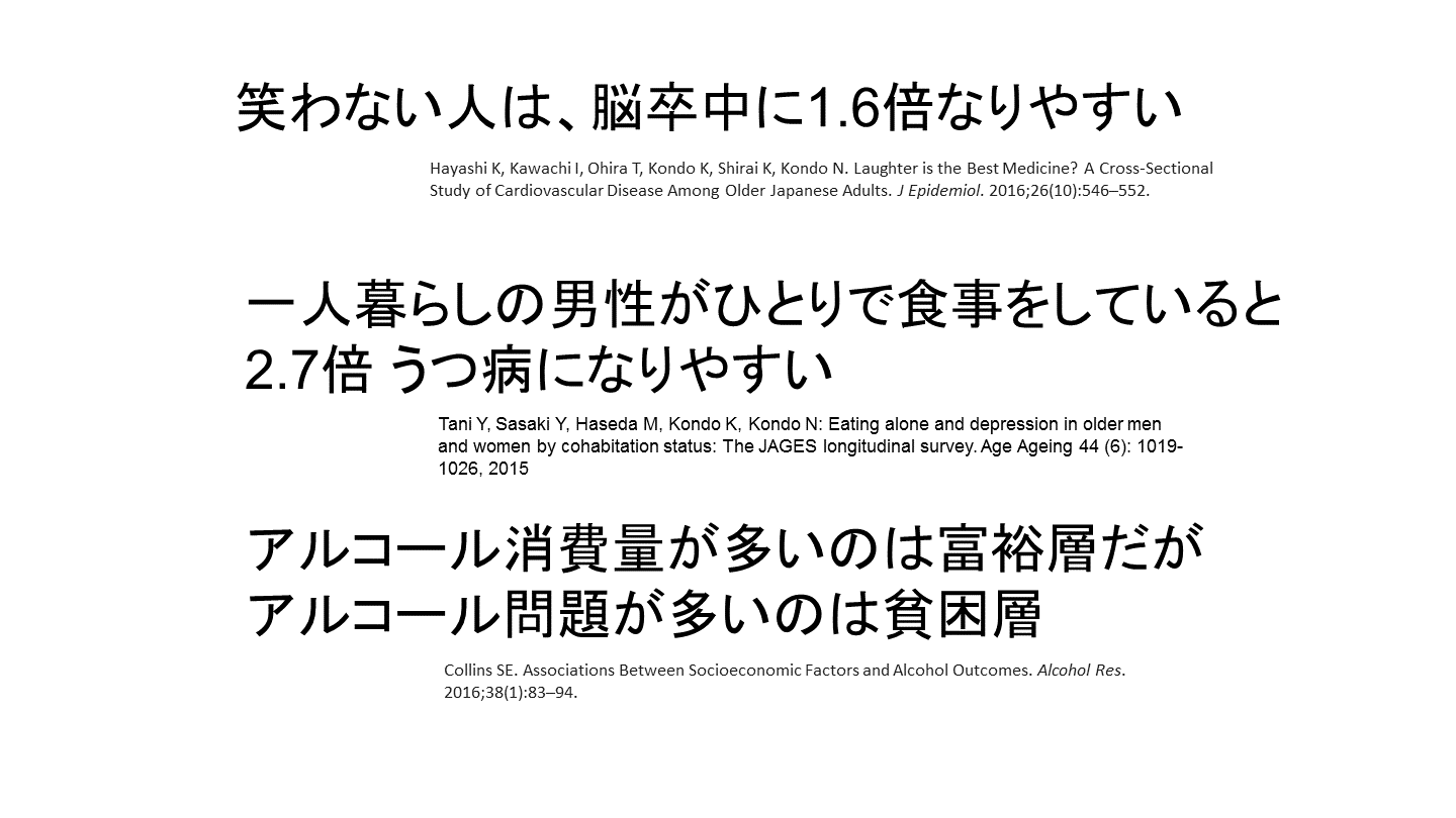 #35. 笑わない人は、脳卒中に1.6倍なりやすい Hayashi K, Kawachi I, Ohira T, Kondo K, Shirai K, Kondo N. Laughter is the Best Medicine? A Cross-Sectional Study of Cardiovascular Disease Among Older Japanese Adults. J Epidemiol. 2016;26(10):546–552. Tani Y, Sasaki Y, Haseda M, Kondo K, Kondo N: Eating alone and depression in older men and women by cohabitation status: The JAGES longitudinal survey. Age Ageing 44 (6): 1019-1026, 2015 一人暮らしの男性がひとりで食事をしていると