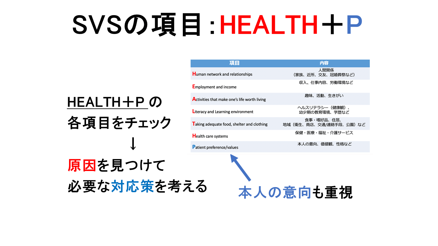 必要な対応策を考える SVSの項目:HEALTH+P HEALTH+P の
