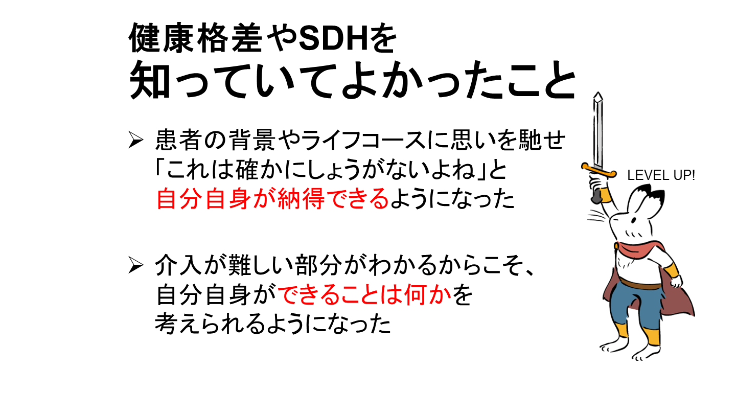 #67. 健康格差やSDHを知っていてよかったこと 患者の背景やライフコースに思いを馳せ「これは確かにしょうがないよね」と自分自身が納得できるようになった 介入が難しい部分がわかるからこそ、自分自身ができることは何かを考えられるようになった LEVEL UP!