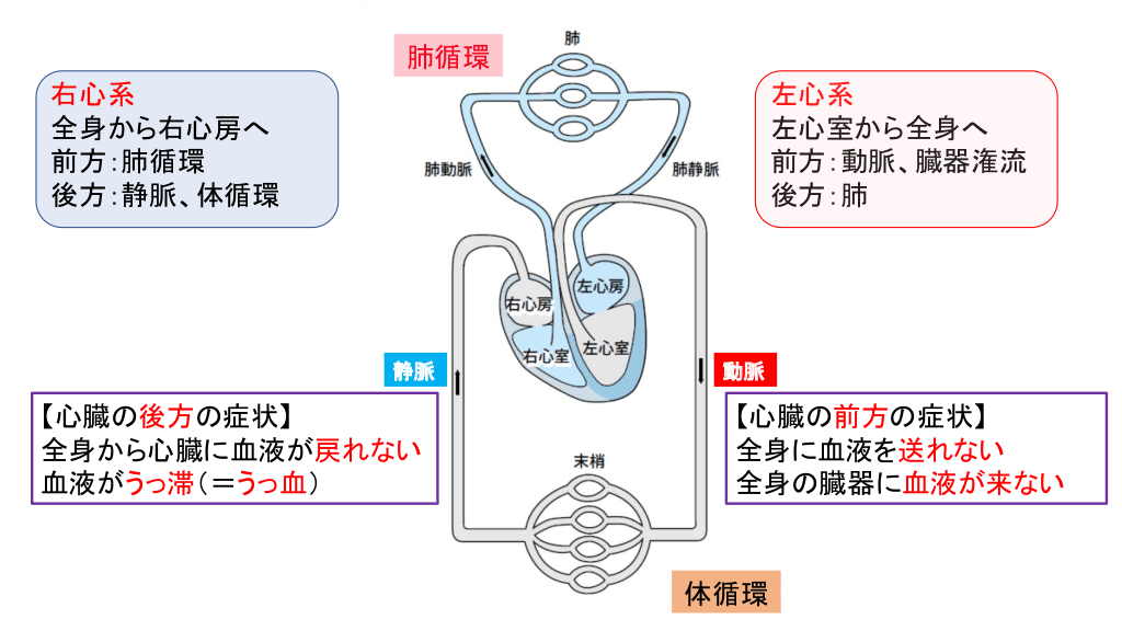 #3. 肺循環 右心系 全身から右心房へ 前方:肺循環 後方:静脈、体循環 左心系 左心室から全身へ 前方:動脈、臓器潅流 後方:肺 静脈 【心臓の後方の症状】 全身から心臓に血液が戻れない 血液がうっ滞(=うっ血) 動脈 【心臓の前方の症状】 全身に血液を送れない 全身の臓器に血液が来ない 体循環
