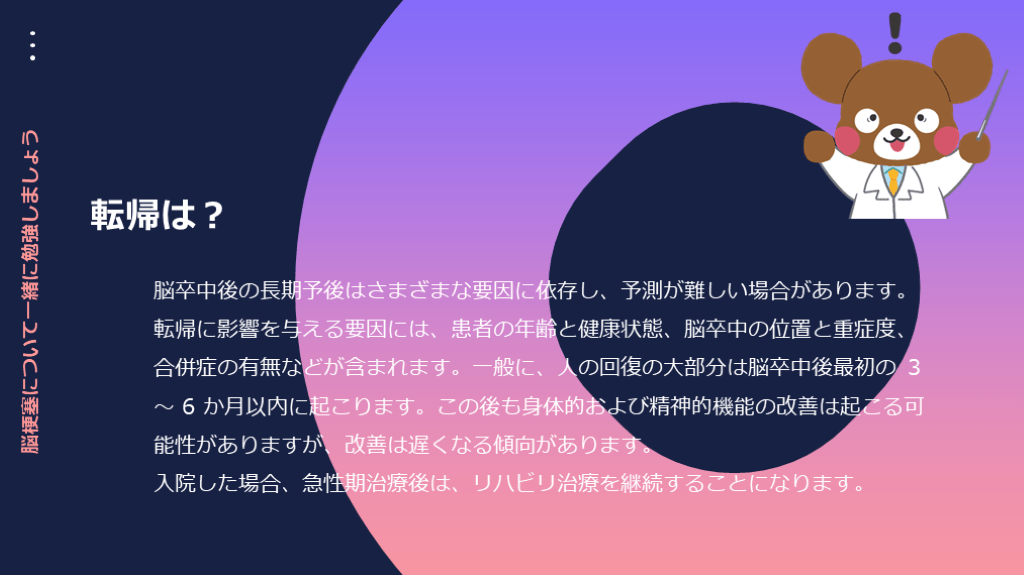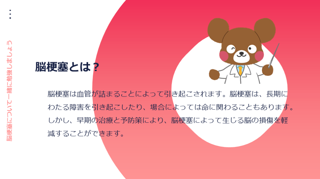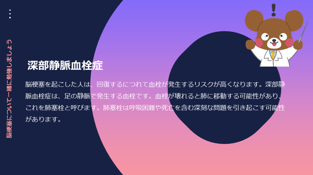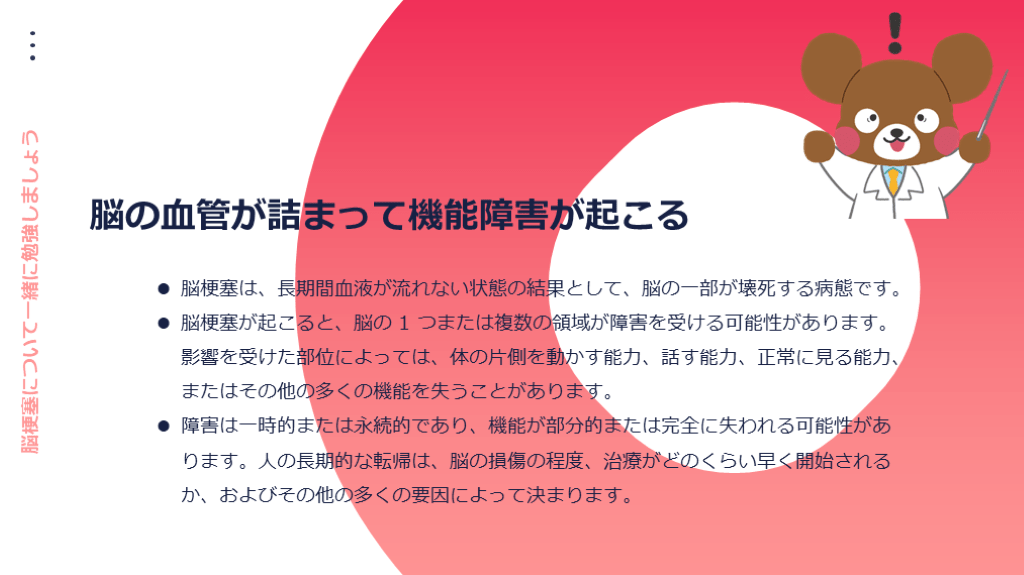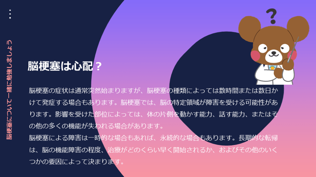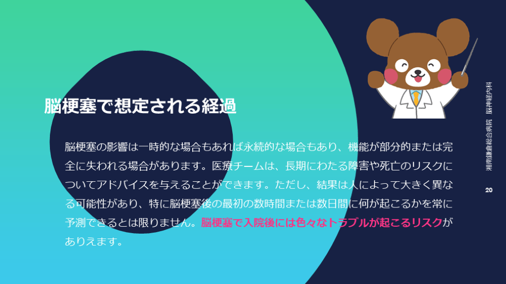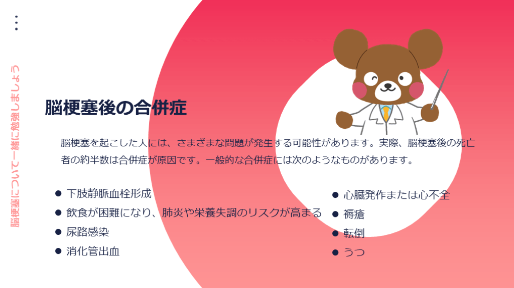 脳梗塞になった場合の色々な問題も知りましょう。 病気理解の一助になりますよう。