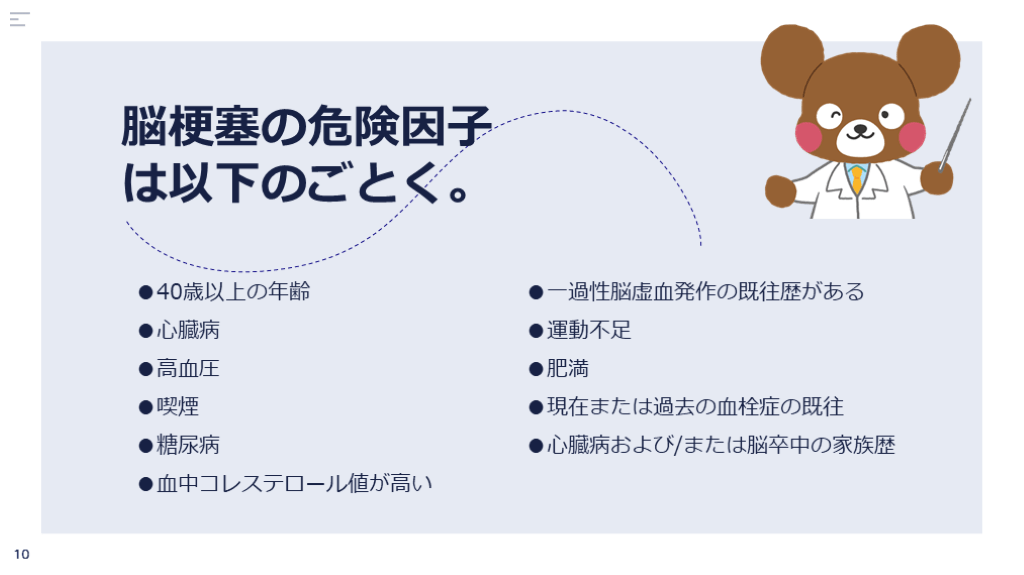 脳梗塞の危険因子は以下のごとく。 ●40歳以上の年齢