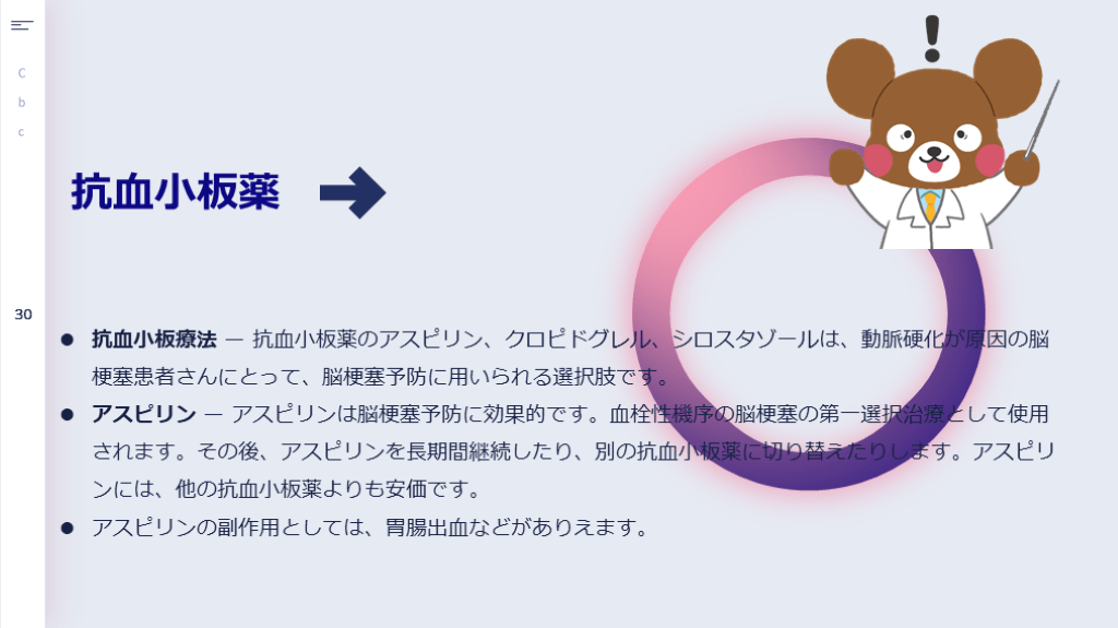 アスピリンの副作用としては、胃腸出血などがありえます。  脳梗塞の外科的治療と血行再建術 #31.