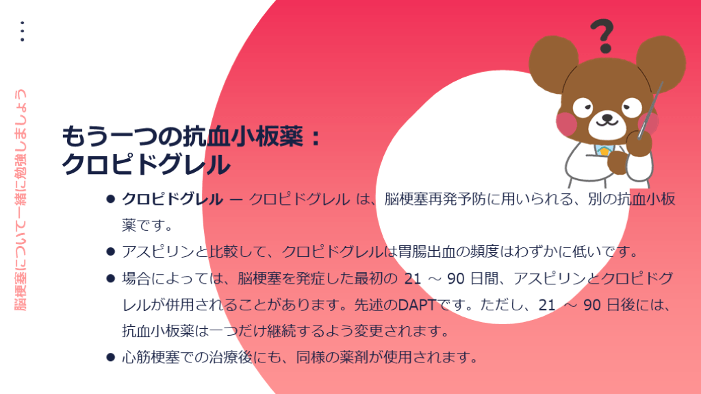 場合によっては、脳梗塞を発症した最初の 21 ~ 90 日間、アスピリンとクロピドグレルが併用されることがあります。先述のDAPTです。ただし、21 ~ 90 日後には、抗血小板薬は一つだけ継続するよう変更されます。