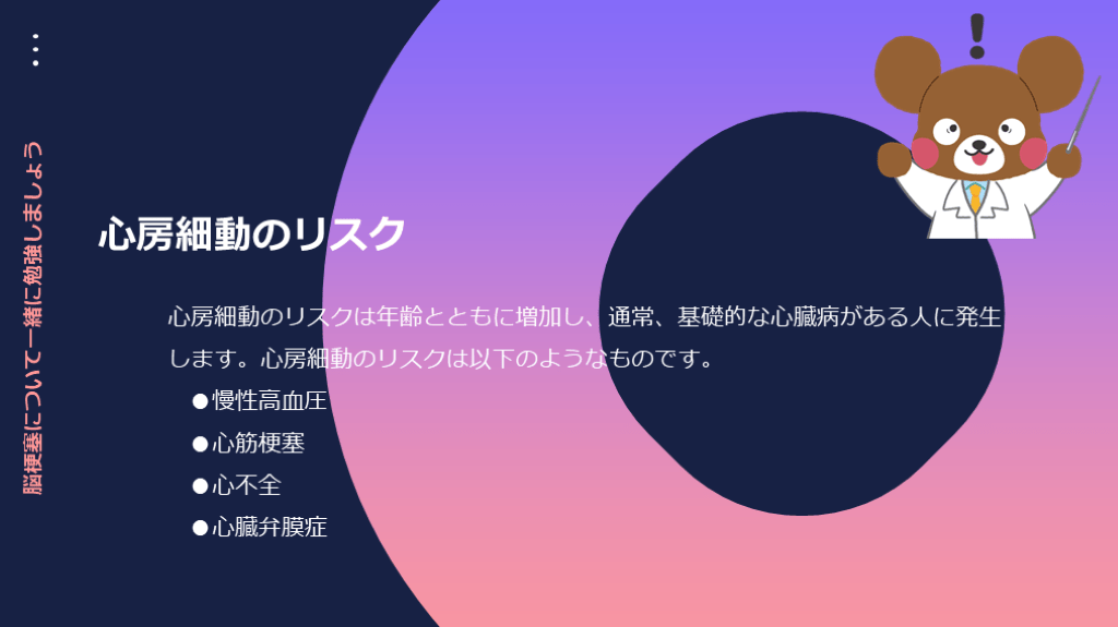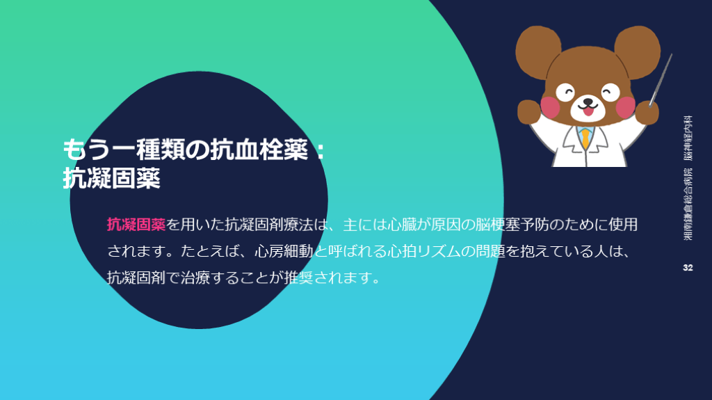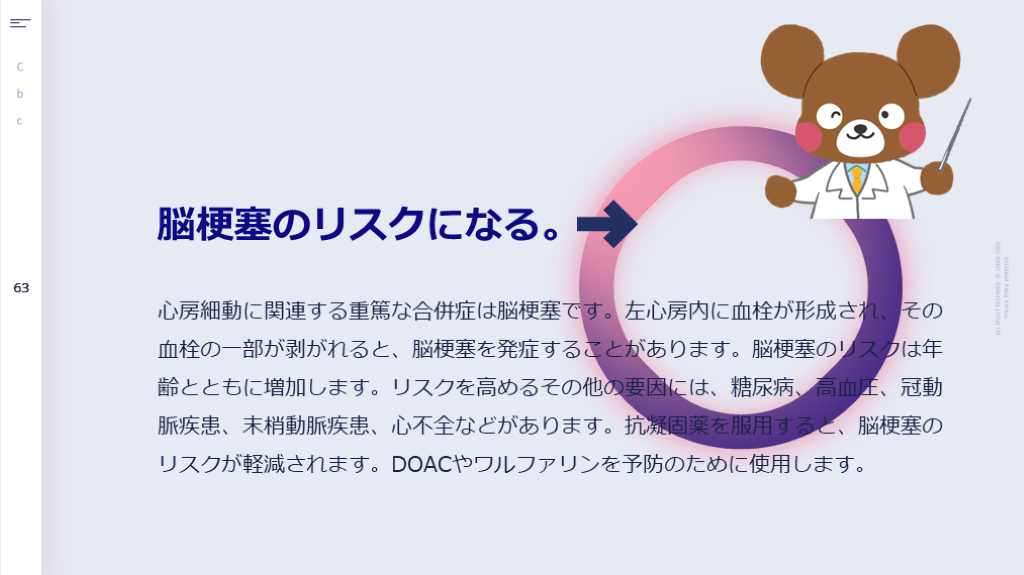 Privacy Policy protected 脳梗塞のリスクになる。 心房細動に関連する重篤な合併症は脳梗塞です。左心房内に血栓が形成され、その血栓の一部が剥がれると、脳梗塞を発症することがあります。脳梗塞のリスクは年齢とともに増加します。リスクを高めるその他の要因には、糖尿病、高血圧、冠動脈疾患、末梢動脈疾患、心不全などがあります。抗凝固薬を服用すると、脳梗塞のリスクが軽減されます。DOACやワルファリンを予防のために使用します。  #65.  https://unsplash.com/photos/SYbD0jfSF3s  抗凝固薬:ワルファリン・DOAC 抗凝固薬は、脳梗塞のリスクが高い人の血栓を防ぐ最も効果的な治療法です。抗凝固薬を服用すると、脳梗塞のリスクを約 50 ~ 70% 軽減できます。