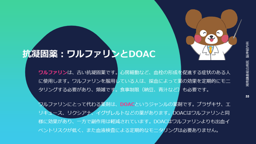 ワルファリンにとって代わる薬剤は、DOACというジャンルの薬剤です。プラザキサ、エリキュース、リクシアナ、イグザレルトなどの薬があります。DOACはワルファリンと同様に効果があり、一方で副作用は軽減されています。DOACはワルファリンよりも出血イベントリスクが低く、また血液検査による定期的なモニタリングは必要ありません。 #34.