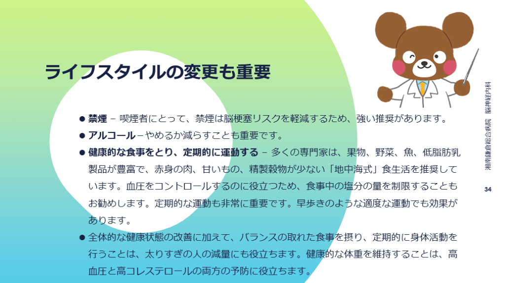 ライフスタイルの変更も重要 禁煙 – 喫煙者にとって、禁煙は脳梗塞リスクを軽減するため、強い推奨があります。