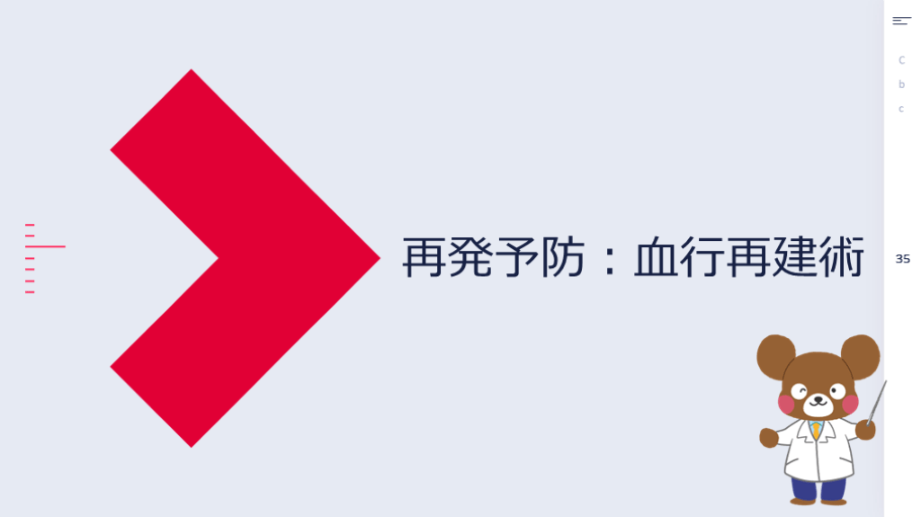 細い血管を拡張する 頸動脈の血行再建 — 血行再建とは、血管狭窄を来している部位の治療を行う事で、血流を改善することを意味します。脳梗塞を起こした人の場合、血行再建とは通常、頸動脈の狭窄部を拡げることを目的とした処置を指します。