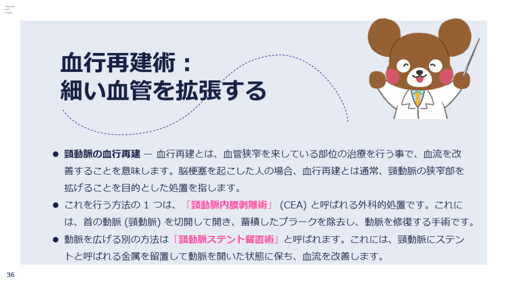 動脈を広げる別の方法は「頸動脈ステント留置術」と呼ばれます。これには、頸動脈にステントと呼ばれる金属を留置して動脈を開いた状態に保ち、血流を改善します。  脳梗塞後の合併症とそのリスク #37.