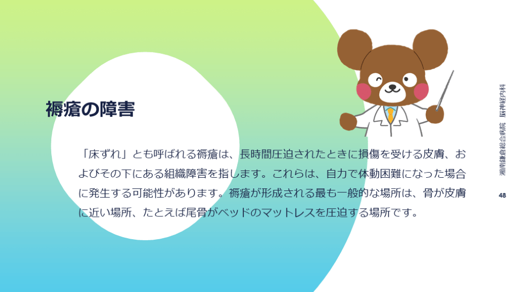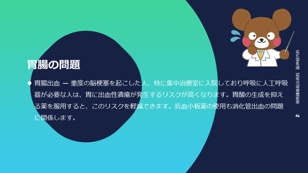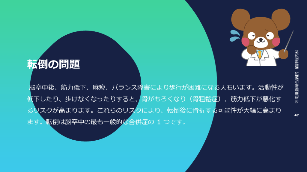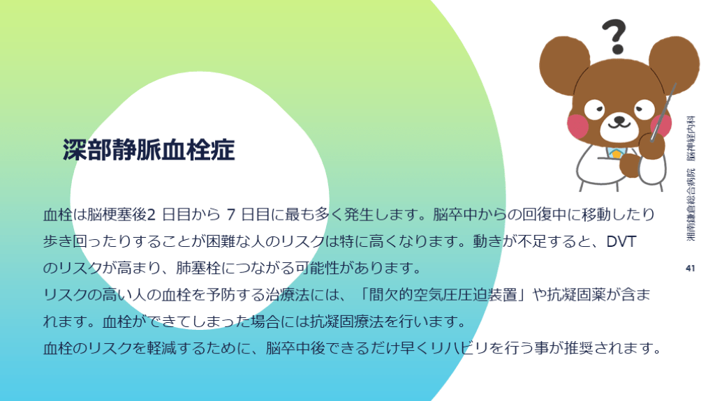 血栓のリスクを軽減するために、脳卒中後できるだけ早くリハビリを行う事が推奨されます。 #42.