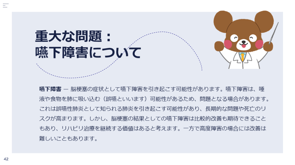 嚥下障害について 嚥下障害 — 脳梗塞の症状として嚥下障害を引き起こす可能性があります。嚥下障害は、唾液や食物を肺に吸い込む(誤嚥といいます)可能性があるため、問題となる場合があります。これは誤嚥性肺炎として知られる肺炎を引き起こす可能性があり、長期的な問題や死亡のリスクが高まります。しかし、脳梗塞の結果としての嚥下障害は比較的改善も期待できることもあり、リハビリ治療を継続する価値はあると考えます。一方で高度障害の場合には改善は難しいこともあります。  #43.
