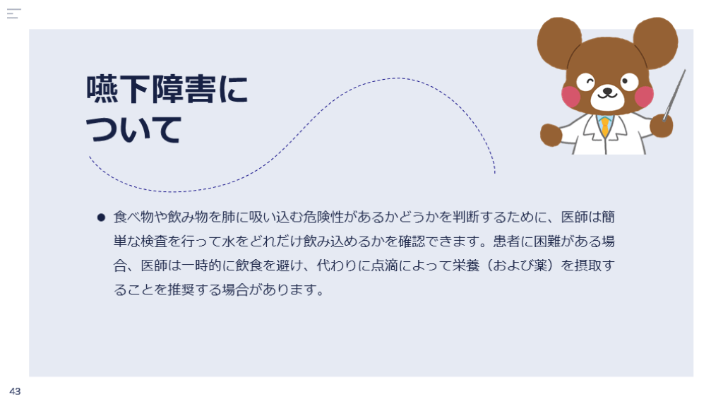 ついて 食べ物や飲み物を肺に吸い込む危険性があるかどうかを判断するために、医師は簡単な検査を行って水をどれだけ飲み込めるかを確認できます。患者に困難がある場合、医師は一時的に飲食を避け、代わりに点滴によって栄養(および薬)を摂取することを推奨する場合があります。  #44.