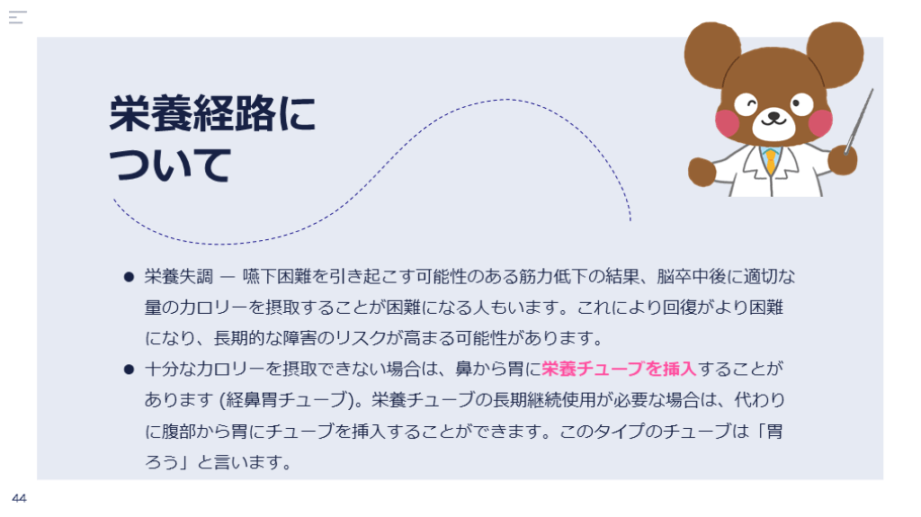 ついて 栄養失調 — 嚥下困難を引き起こす可能性のある筋力低下の結果、脳卒中後に適切な量のカロリーを摂取することが困難になる人もいます。これにより回復がより困難になり、長期的な障害のリスクが高まる可能性があります。