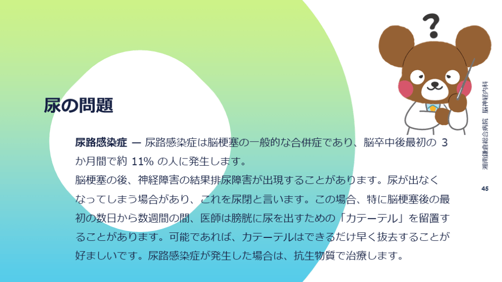 脳梗塞の後、神経障害の結果排尿障害が出現することがあります。尿が出なくなってしまう場合があり、これを尿閉と言います。この場合、特に脳梗塞後の最初の数日から数週間の間、医師は膀胱に尿を出すための「カテーテル」を留置することがあります。可能であれば、カテーテルはできるだけ早く抜去することが好ましいです。尿路感染症が発生した場合は、抗生物質で治療します。 脳梗塞の長期的な転帰と予後 #50.