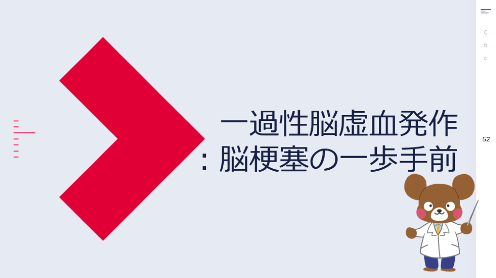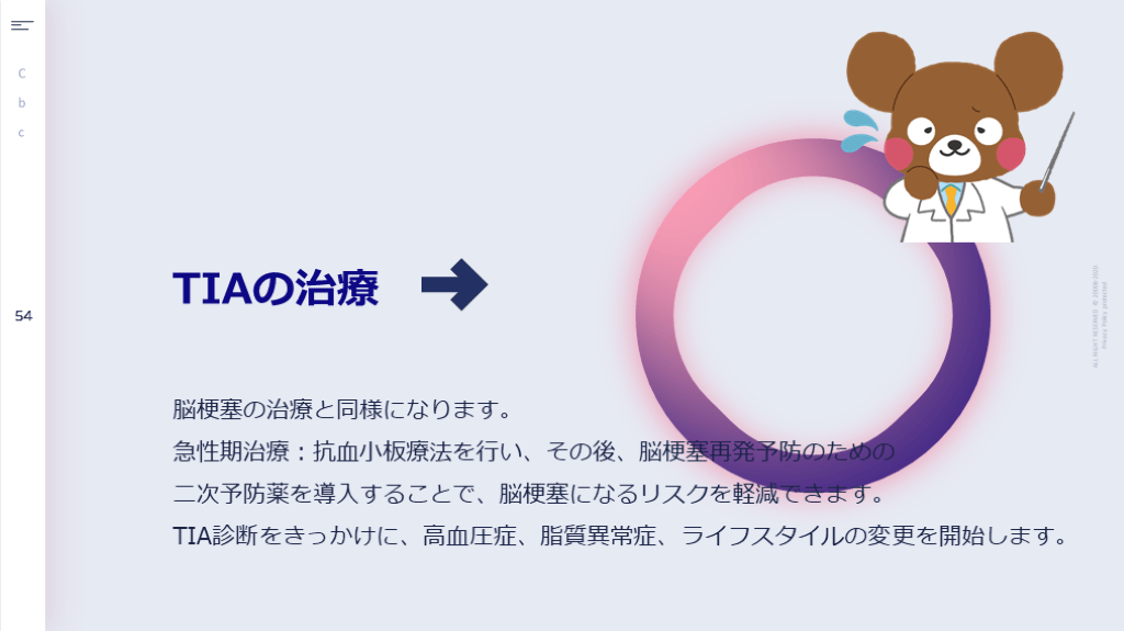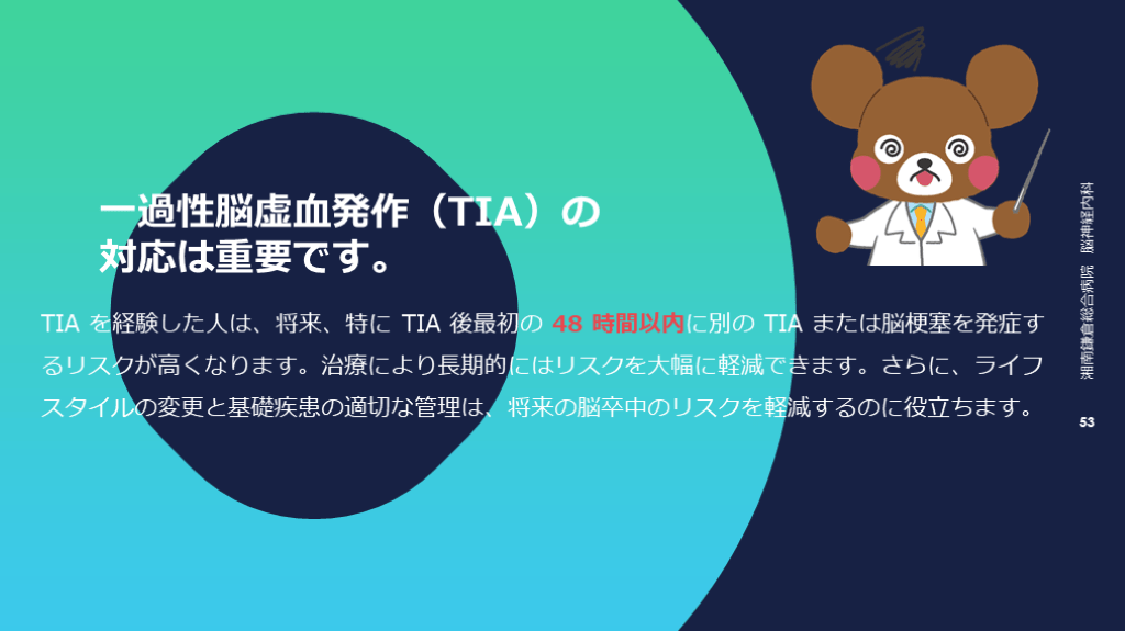TIA は、脳卒中のリスクが高いことを示す警告サインです。直ちに治療を受けることで、このリスクを軽減または排除できます。TIAだと考えても、実際には脳梗塞を起こしている可能性もあり、症状改善があったとしても病院受診が必要です。 脳梗塞のリスク因子と危険性 #10.