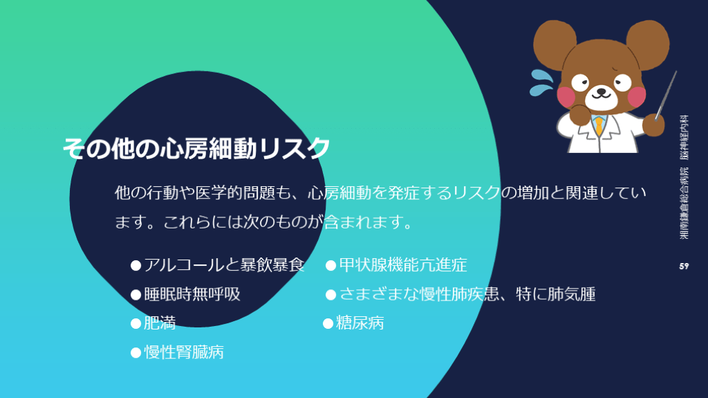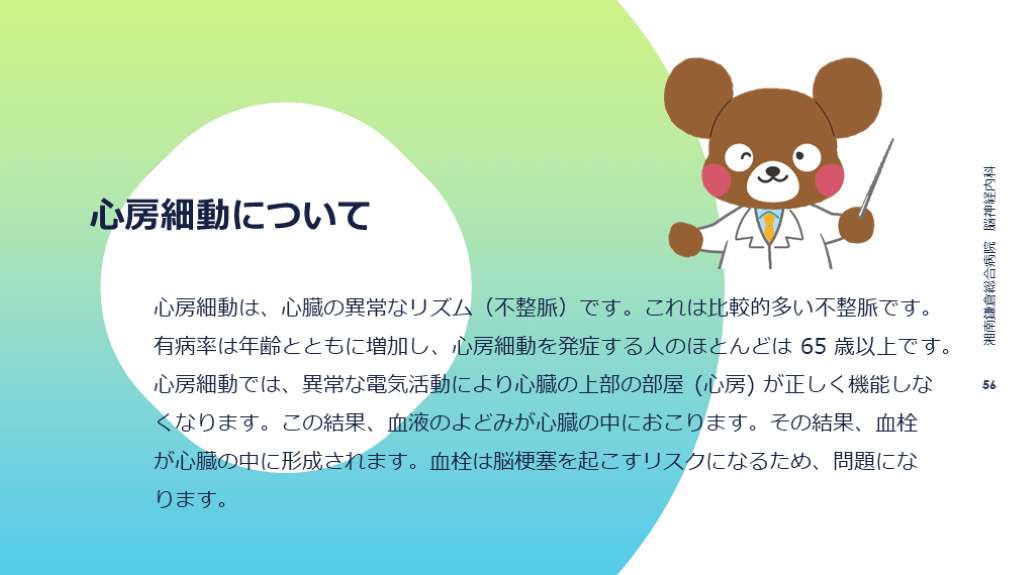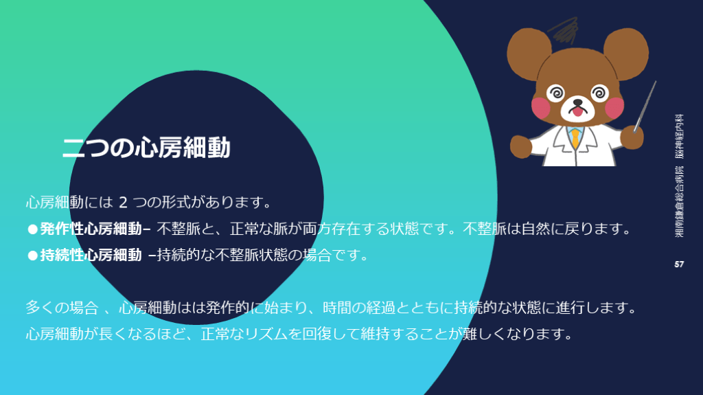 多くの場合 、心房細動はは発作的に始まり、時間の経過とともに持続的な状態に進行します。心房細動が長くなるほど、正常なリズムを回復して維持することが難しくなります。 #63.