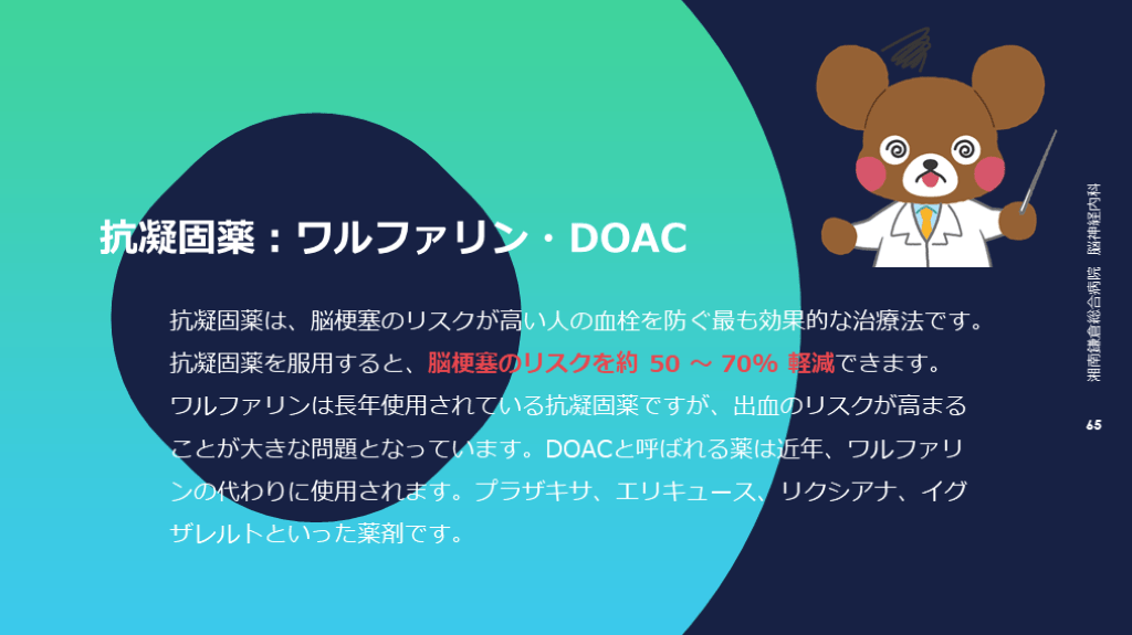 ワルファリンは長年使用されている抗凝固薬ですが、出血のリスクが高まることが大きな問題となっています。DOACと呼ばれる薬は近年、ワルファリンの代わりに使用されます。プラザキサ、エリキュース、リクシアナ、イグザレルトといった薬剤です。 #67.