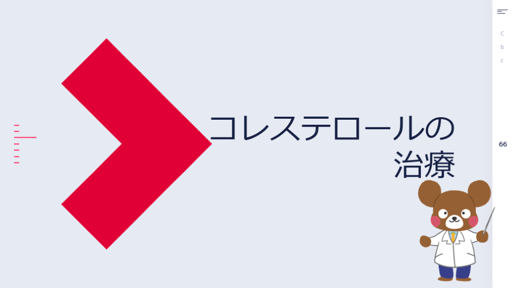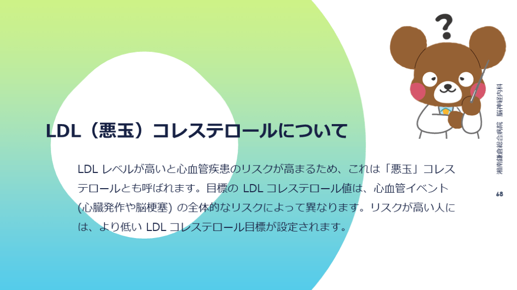コレステロールについて コレステロールや中性脂肪などの血液中の脂質(脂肪)レベルが高いことは、「高脂血症」とも呼ばれます。高脂血症は、血管壁の狭窄や閉塞による心臓発作、脳梗塞、その他の重篤な問題のリスクを大幅に高める可能性があります。これらのリスクを下げるために、食事の変更、運動、薬物療法を組み合わせてコレステロール値を下げるよう勧められます。ほとんどのコレステロール低下療法は、 LDL(悪玉)コレステロールを減らすことを目的としています。高レベルの LDL はアテローム性動脈硬化 (血管内の脂肪沈着物の蓄積) を引き起こす可能性があり、これは心血管イベント (心臓発作、脳卒中、下肢または末梢動脈疾患) の主な原因です。  #71.