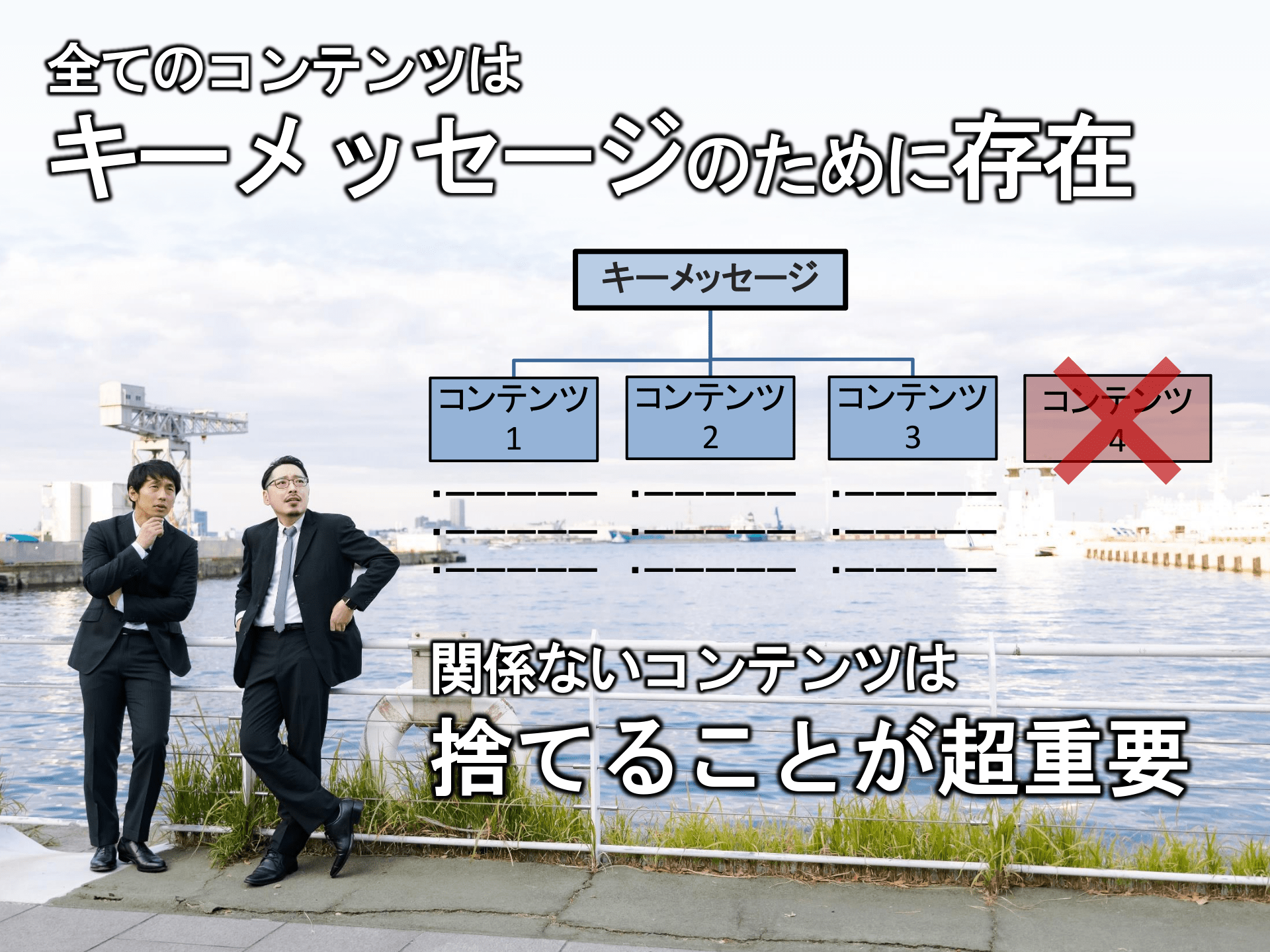 #6. 全てのコンテンツは キーメッセージのために存在 キーメッセージ コンテンツ 1 コンテンツ 2 コンテンツ 3 コンテンツ 4 ・ーーーーー ・ーーーーー ・ーーーーー ・ーーーーー ・ーーーーー ・ーーーーー ・ーーーーー ・ーーーーー ・ーーーーー 関係ないコンテンツは 捨てることが超重要