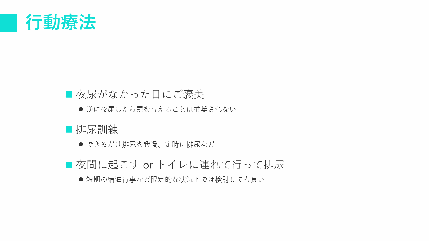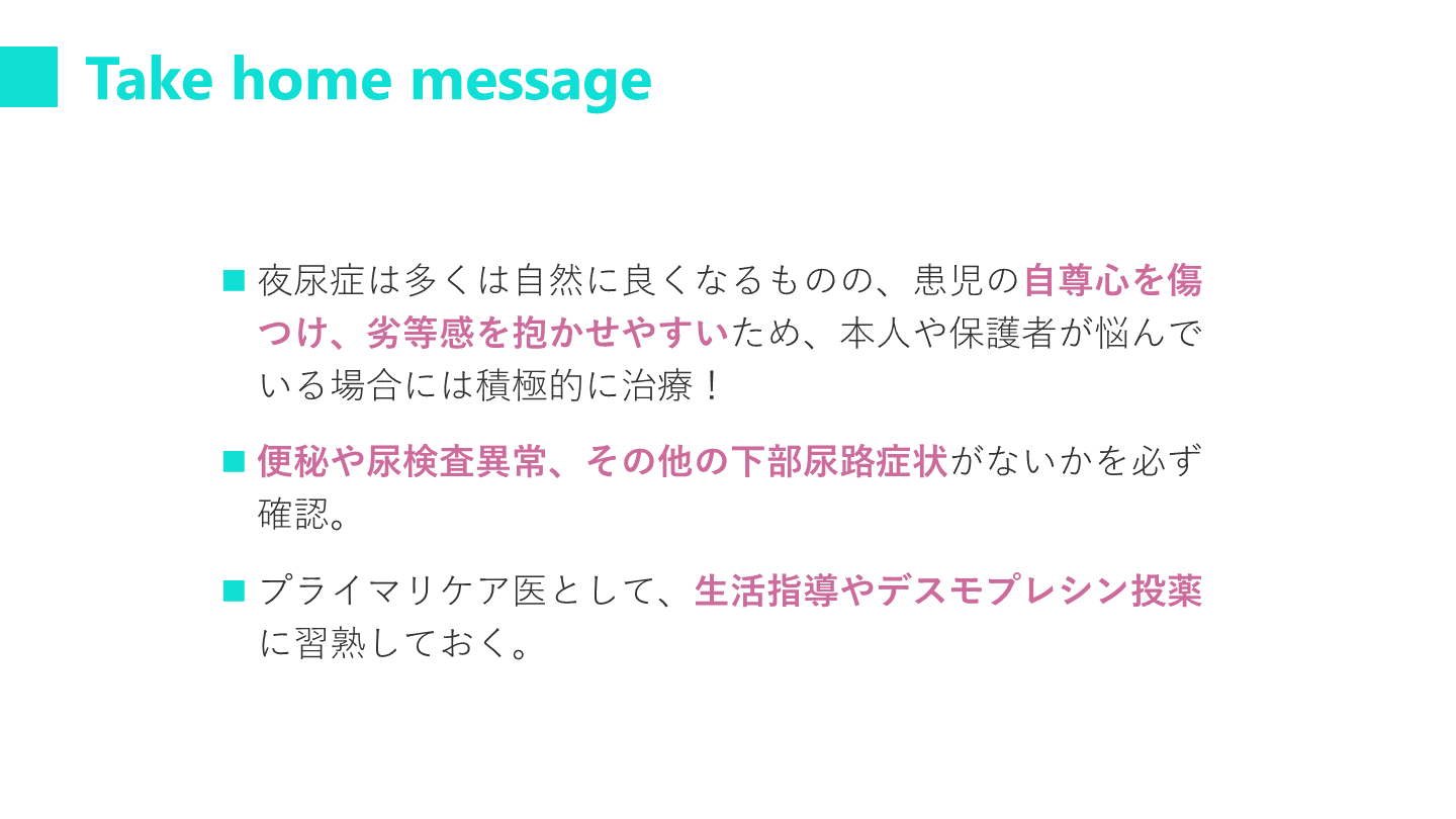 #2. Take home message 夜尿症は多くは自然に良くなるものの、患児の自尊心を傷つけ、劣等感を抱かせやすいため、本人や保護者が悩んでいる場合には積極的に治療!