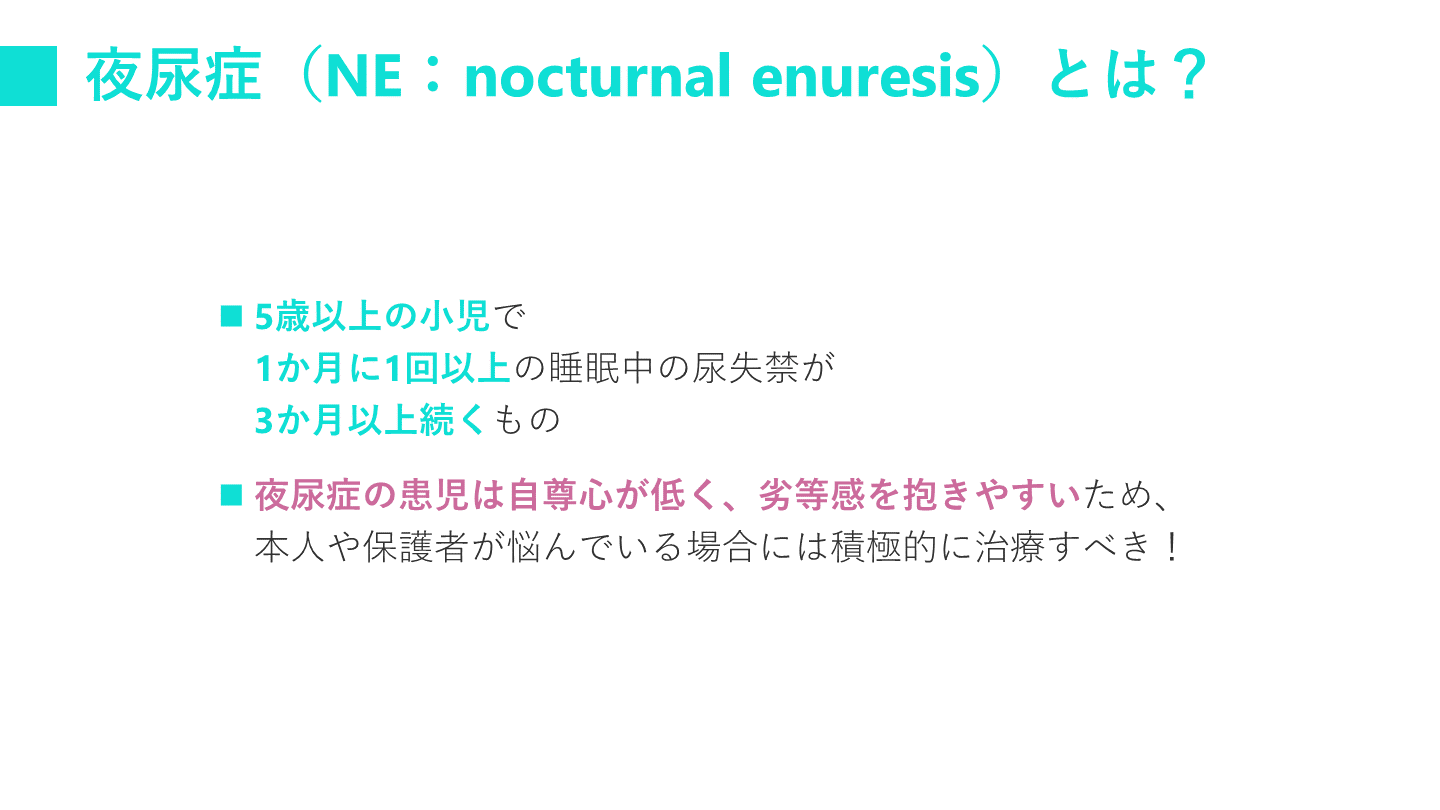 夜尿症の患児は自尊心が低く、劣等感を抱きやすいため、本人や保護者が悩んでいる場合には積極的に治療すべき!