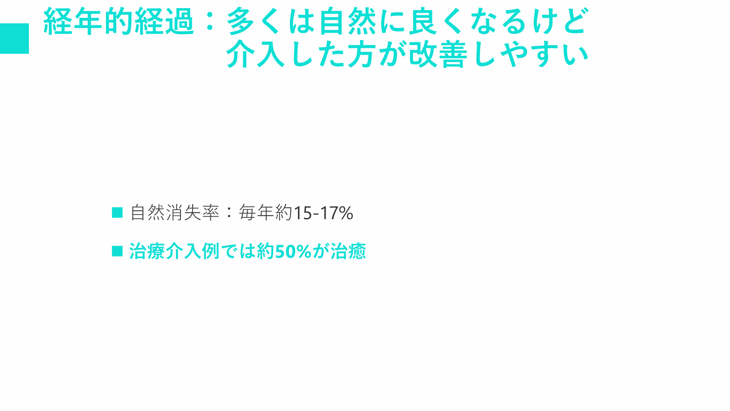 #8. 経年的経過:多くは自然に良くなるけど 介入した方が改善しやすい 自然消失率:毎年約15-17%