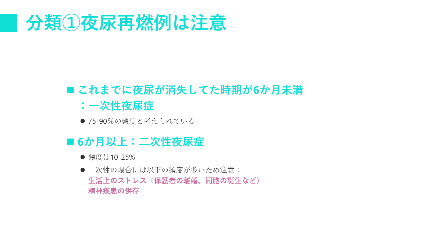 #9. 分類①夜尿再燃例は注意 これまでに夜尿が消失してた時期が6か月未満:一次性夜尿症