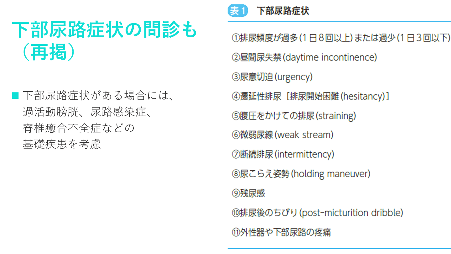 (再掲) 下部尿路症状がある場合には、過活動膀胱、尿路感染症、脊椎癒合不全症などの基礎疾患を考慮