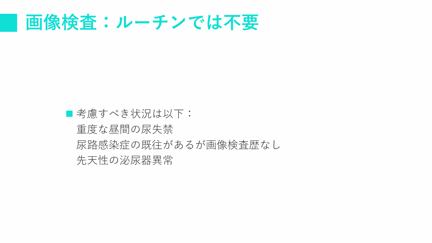 #17. 画像検査:ルーチンでは不要 考慮すべき状況は以下:重度な昼間の尿失禁尿路感染症の既往があるが画像検査歴なし先天性の泌尿器異常